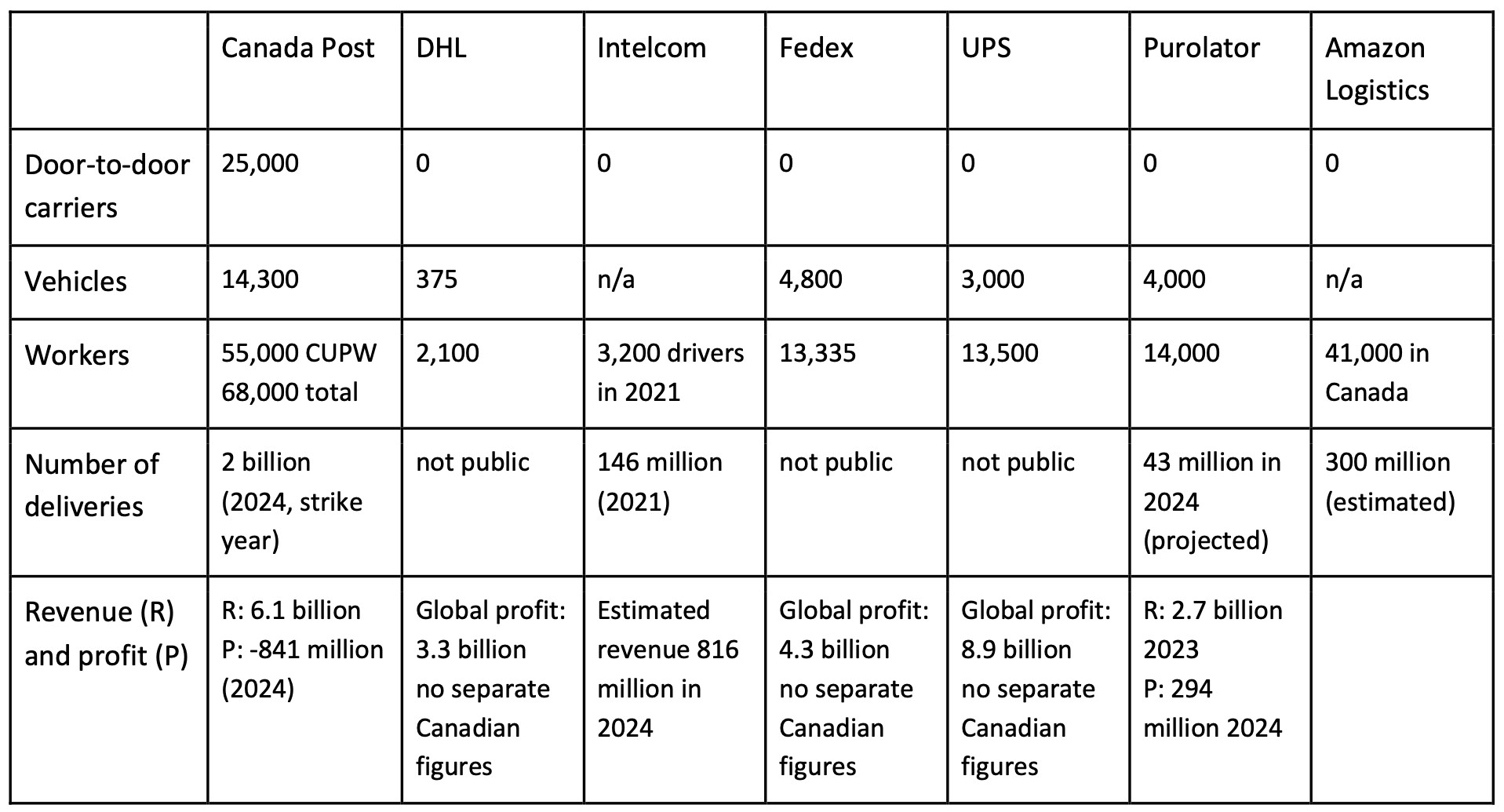 The table below compares a handful of the biggest players in mail and parcel delivery in Canada. We can see right away that Canada Post is the only company providing door-to-door delivery, employing some 25,000 mail carriers. The rest of the companies don’t provide this service as it isn’t profitable. Canada Post owns just under half of the combined delivery fleets of the listed companies, keeping in mind that Intelcom doesn’t disclose the size of its fleet, and employed upwards of 3,200 drivers almost 5 years ago (the last available numbers).
